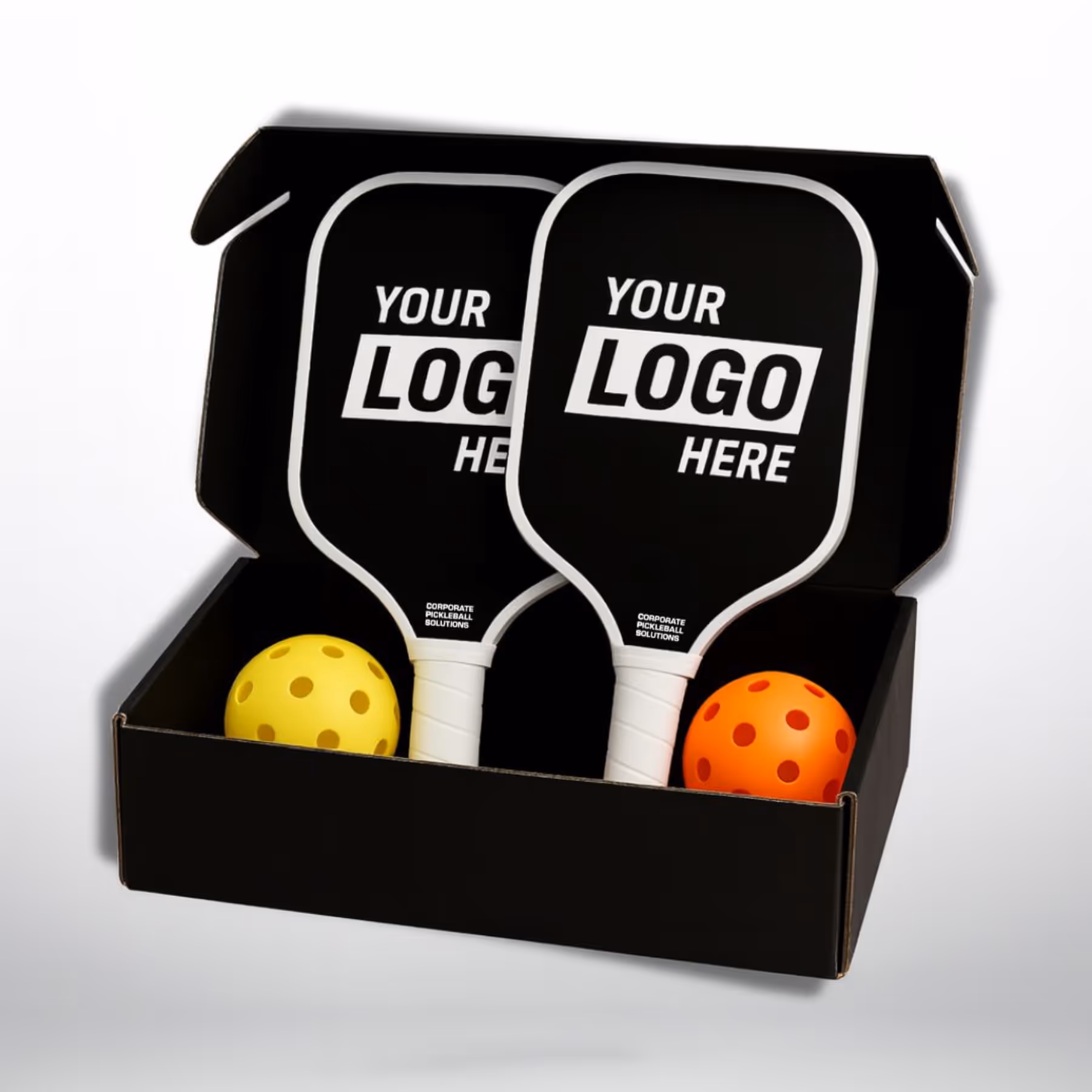 Includes 4 custom paddles, 4 pickleballs, and a custom presentation box.